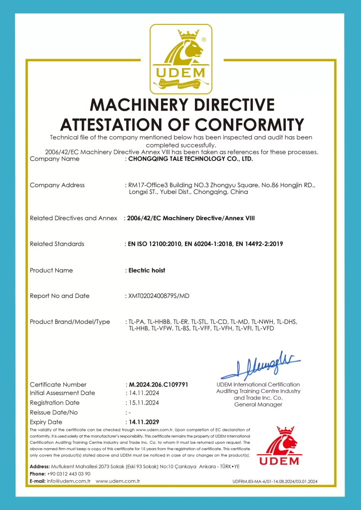 - Chain Hoist CE Certificate