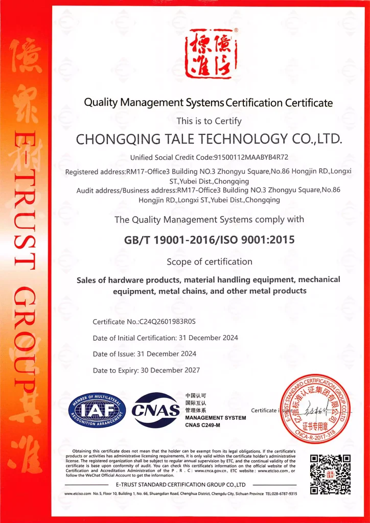 Chongqing Tale Technology Co., Ltd. (hereinafter referred to as “Chongqing Tale Technology”) is a subsidiary of Chongqing Tools Industries, which focuses on production. It carries forward the industry accumulation and global vision of its parent company and officially set sail in 2021. Tale Technology specializes in the design, manufacture, and sales of lifting and material handling tools and equipment. All of our products are produced under strict quality control. Our factory has obtained ISO 9001 certification, and most of our products have also obtained CE certification.